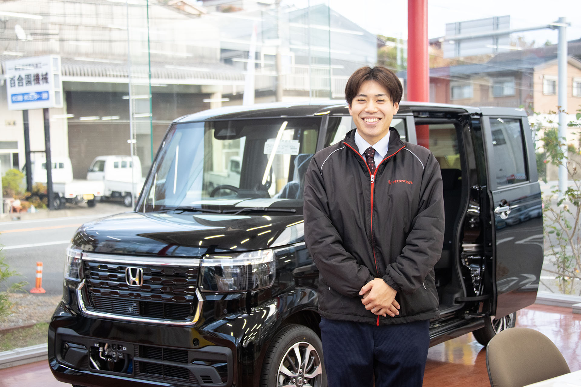 日之影町から通勤する山室さんは、入社2年目。Honda Cars 延岡北との出会いは、自分の車を探していた時のことでした。いくつかの店舗を回ったものの、なかなか希望の車種に出合えず、ようやく同店で見つけたことがきっかけだったといいます。「事務業務だけでなく、接客の仕事にも携われる職場があればと探していました。実際にお客さまの立場で当店の接客を受け、ここで働きたいと感じたことが入社のきっかけです」と話します。入社当初を振り返り「お客さまに何と声をかけたらいいのか分からない状態でしたが、仕事を重ねるうちに少しずつ慣れていきました。ここは馴染み客も多いです。今では楽しく接客できています」とも。